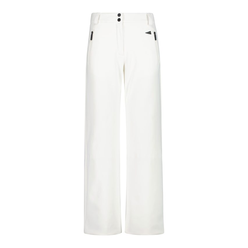 Clean-cut, feminine trousers made of 4-way stretch softshell with a fleece lining. Equipped with a Clima Protect® membrane (WP 8,000 / MVP 5,000) and an internal snow gaiter, they ensure protection and breathability. The waistband with belt loops and the logo embroidered on the front complete the design.