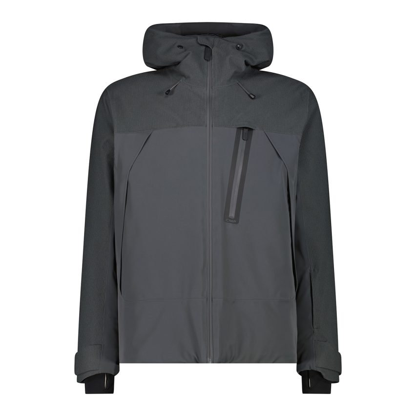 Block-construction jacket with a stretch corduroy upper and a smooth lower section. Featuring a fixed hood and a regular fit, it features 160g Feel Warm Flat insulation and a Clima Protect® membrane (WP 20,000 / MVP 10,000), fully taped seams, and an internal powder skirt. A sophisticated piece designed to stand out on and off the slopes.